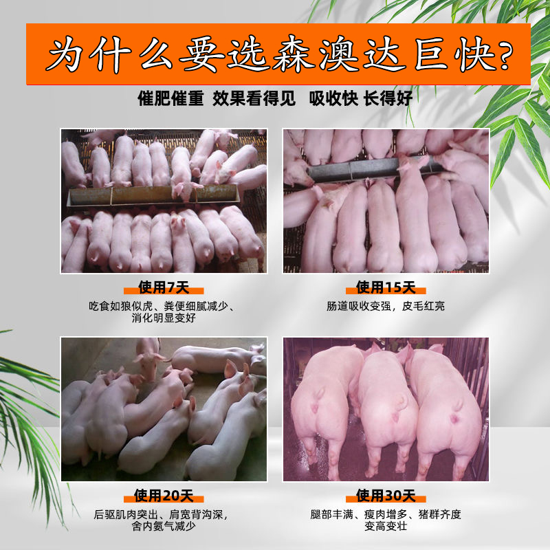 2、提高飼料利用率:清洗腸胃粘膜,胃腸壁厚度變薄,改善腸道免疫屏障,充分消化飼料中的營養(yǎng)物質(zhì),提高飼料消化吸收率,糞便細(xì)膩,飼料殘?jiān)鼛缀跸?,糞便體積量明顯減小。同時(shí)本品可促進(jìn)飼料中碳水化合物的分解,非蛋白氨合成轉(zhuǎn)化為高品質(zhì)蛋白質(zhì),飼料利用率提高20%左右,家畜可提前出欄15-30天。3、改善體型,拉大骨架:明顯改變家畜的體型,肌肉突起,背溝加深,使家畜臀腿肌發(fā)達(dá)飽滿,體形豐滿結(jié)實(shí),改善酮體品質(zhì),提高屠幸瘦肉率896-15%。