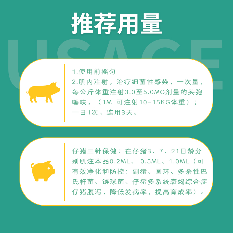 2、仔豬三針保健:在仔豬3、7、21日齡分別肌注本品0.2ml、 0.5ml、1.0ml(可有效凈化、防控:副豬、圓環(huán)、