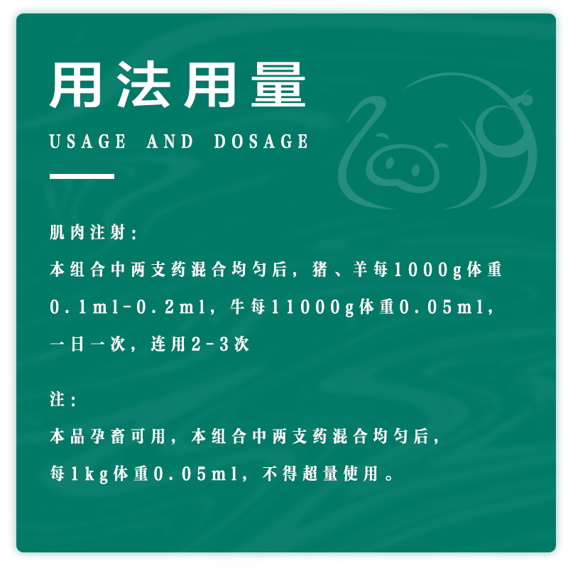 肌肉注射:本組合中兩支藥混合均勻后,豬、羊每1kg體重0.1ml-0.2ml,牛每1kg體重0.05ml,一日一次,連用2-3次。